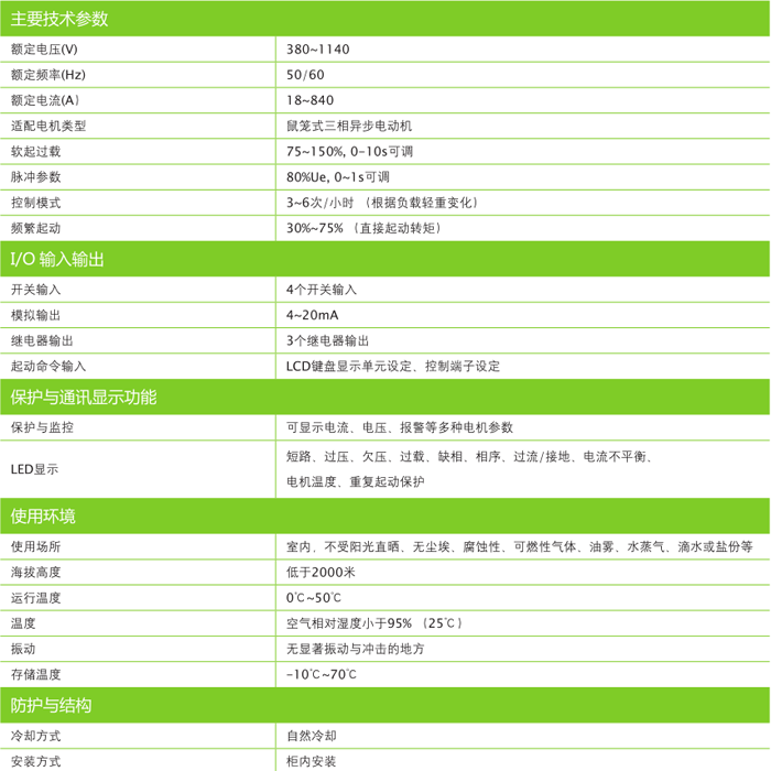 對(duì)電網(wǎng)及機(jī)械設(shè)備沖擊小等優(yōu)點(diǎn),是傳統(tǒng)起動(dòng)方式理想的更新?lián)Q代產(chǎn)品。適用于石油、冶金、礦山、選煤廠含有爆炸性氣體(甲烷)和煤塵的煤礦井下的重載或使用條件惡劣的三相異步電動(dòng)機(jī)的軟起動(dòng)、軟停車控制。